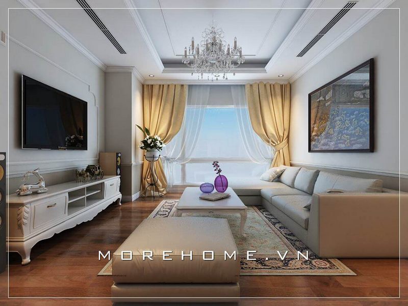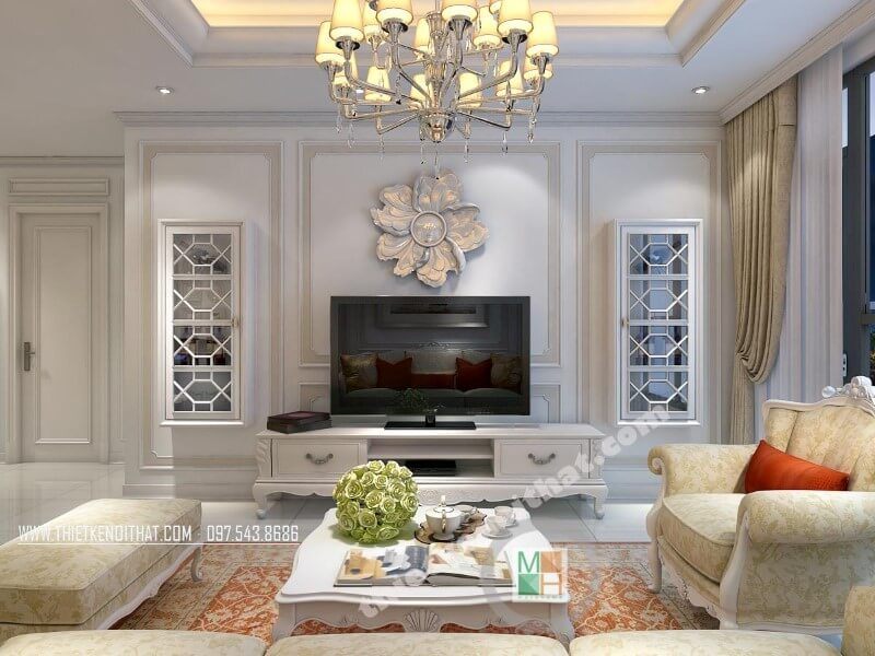 Vẫn là tone màu trắng đóng vai trò chủ đạo, kệ ti vi tân cổ điển với những đường cong được chạm khắc tinh tế, mang đến không gian sang trọng mà không bị rối mắt