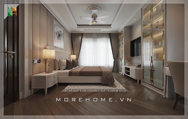 Kệ tivi trong phòng ngủ làm từ chất liệu gỗ óc chó mang đường nét tân cổ điển
