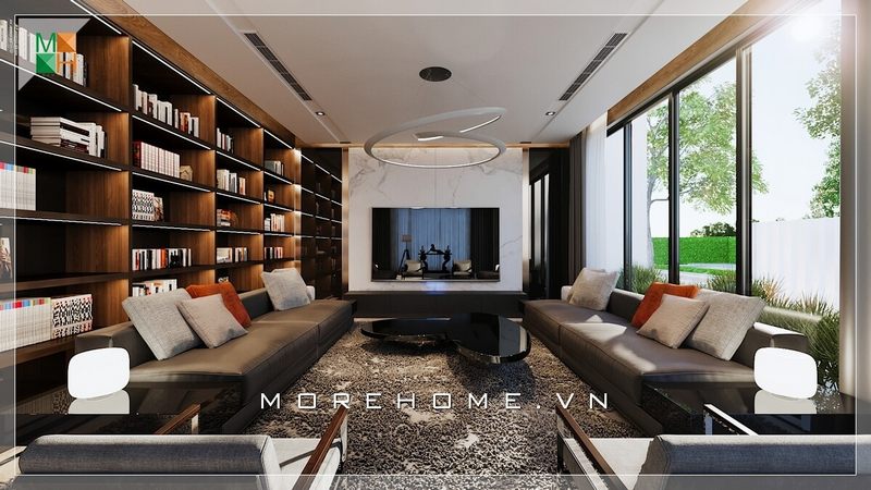 Thiết kế nội thất hiện đại từ sofa, kệ tủ,... và sự thông thoáng rộng mở của không gian tạo nên vẻ đẹp thu hút, ấn tượng cho ngôi biệt thự, nhà phố