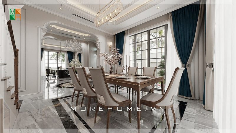 Nội thất phòng ăn của biệt thự, nhà phố sang trọng được thiết kế cao cấp với bộ bàn ghế 8 chỗ ngồi tiện nghi là tâm điểm của toàn bộ căn phòng.