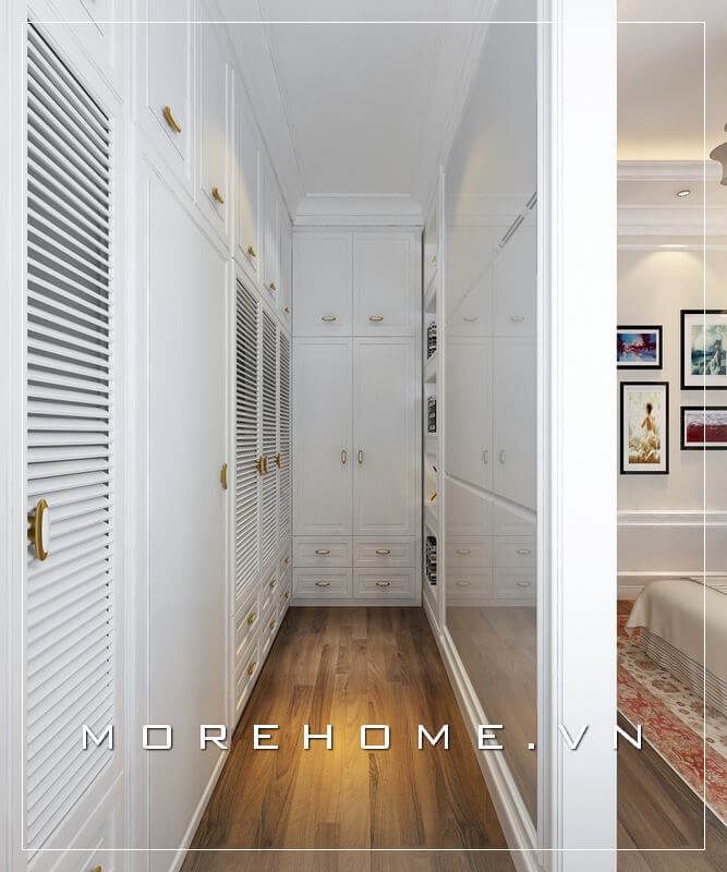 Tủ quần áo gỗ tự nhiên màu trắng sang trọng và tinh tế, lối thiết kế kịch trần tạo cho căn phòng thêm cao và thoáng hơn