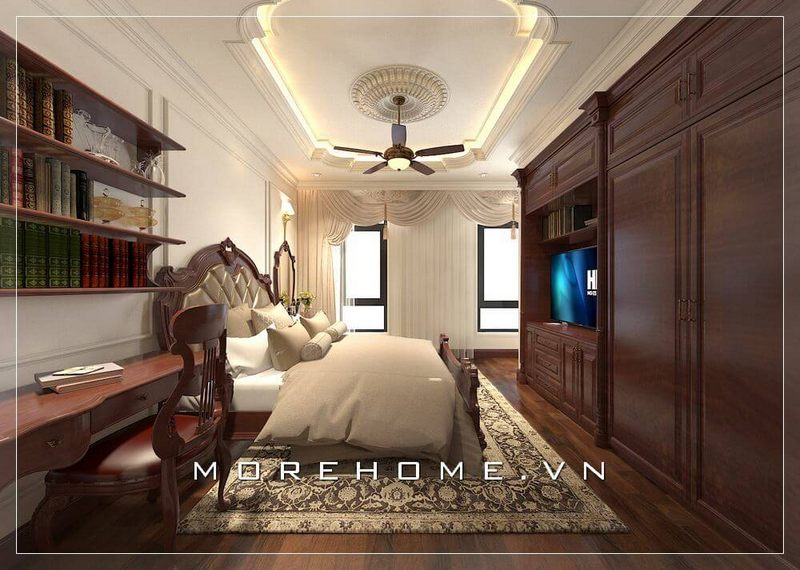 Tủ quần áo gỗ tự nhiên với thiết kế kịch trần kết hợp ngăn kệ không cánh được sang trọng tạo điểm nhấn nổi bật cho căn phòng