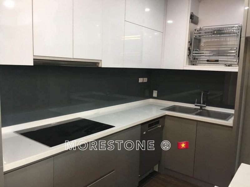 Phòng bếp có đá ốp bếp màu trắng vân mây mang lại ấn tượng tuyệt vời cho gia chủ.